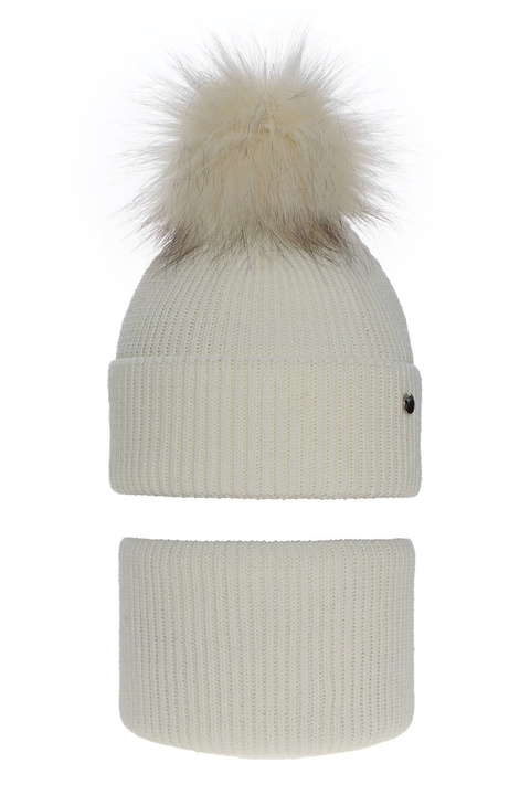 Czapka i szalik dla dziewczynki zimowy komplet, kremowy, z dwoma pomponami Zenda