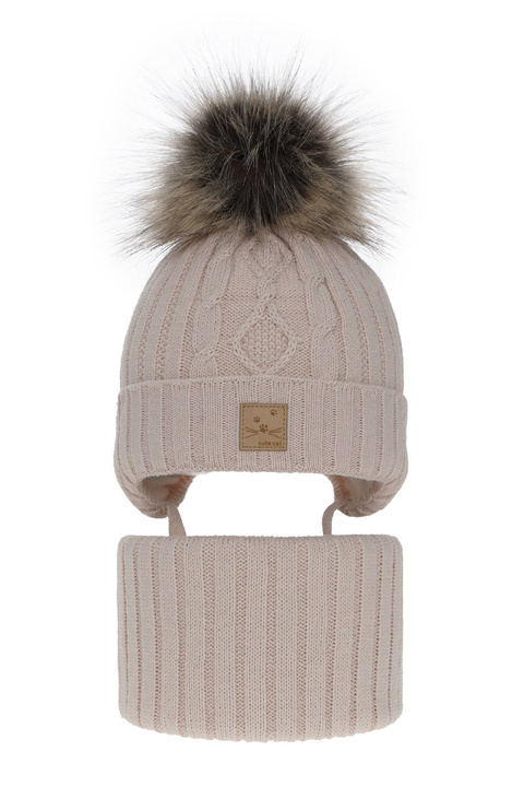 Czapka i komin dla dziewczynki zimowy komplet, beżowy, z pomponem Aida