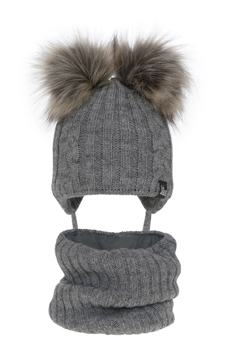Czapka i komin dla dziewczynki zimowy komplet, szary, z dwoma pomponami, wiązany Marlen