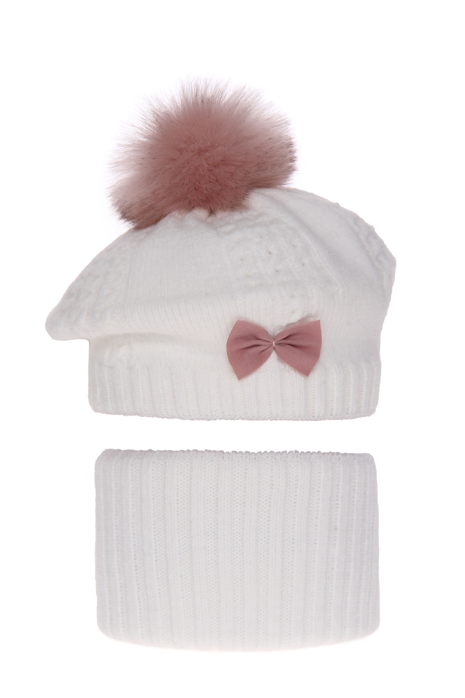 Beret i komin dla dziewczynki zimowy komplet, biały, z pomponem Amora