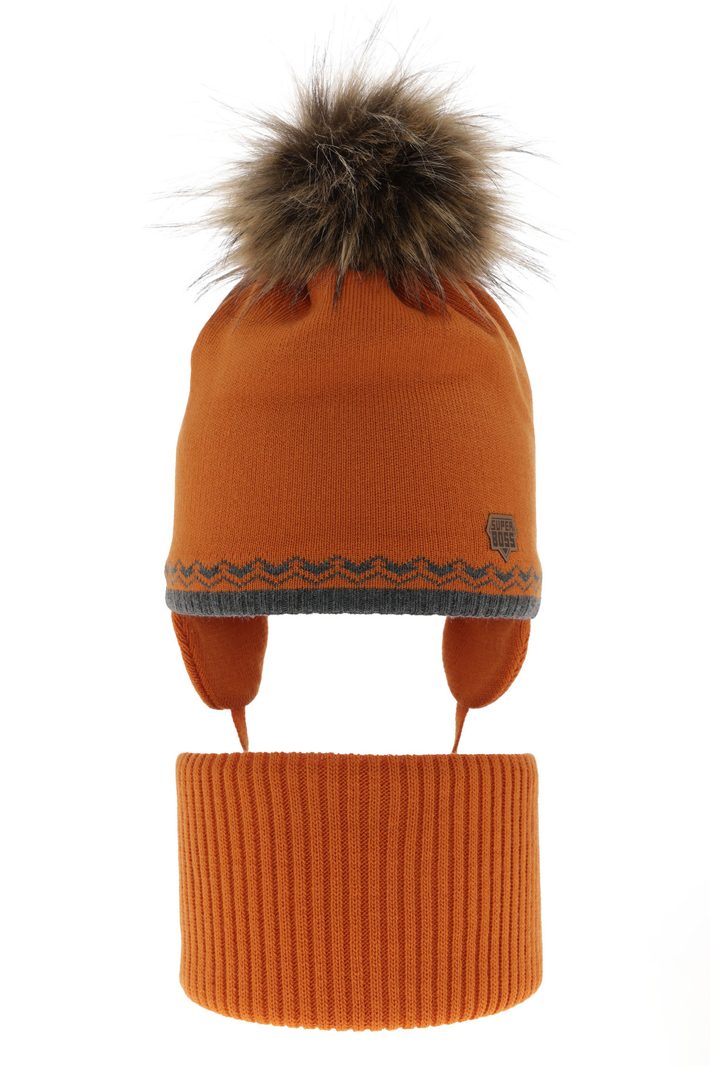 Czapka i komin dla chłopca zimowy komplet, pomarańczowy, z pomponem, wiązany Elpis