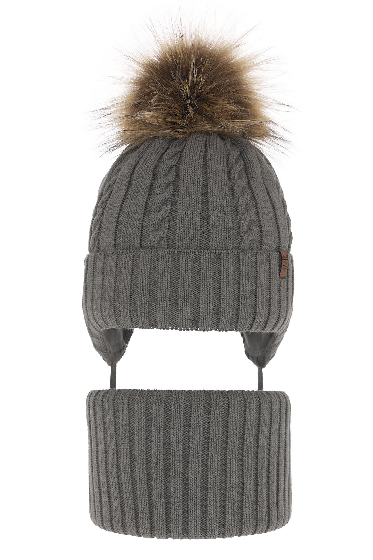 Czapka i komin dla chłopca zimowy komplet, szary, z pomponem, wiązany Peter