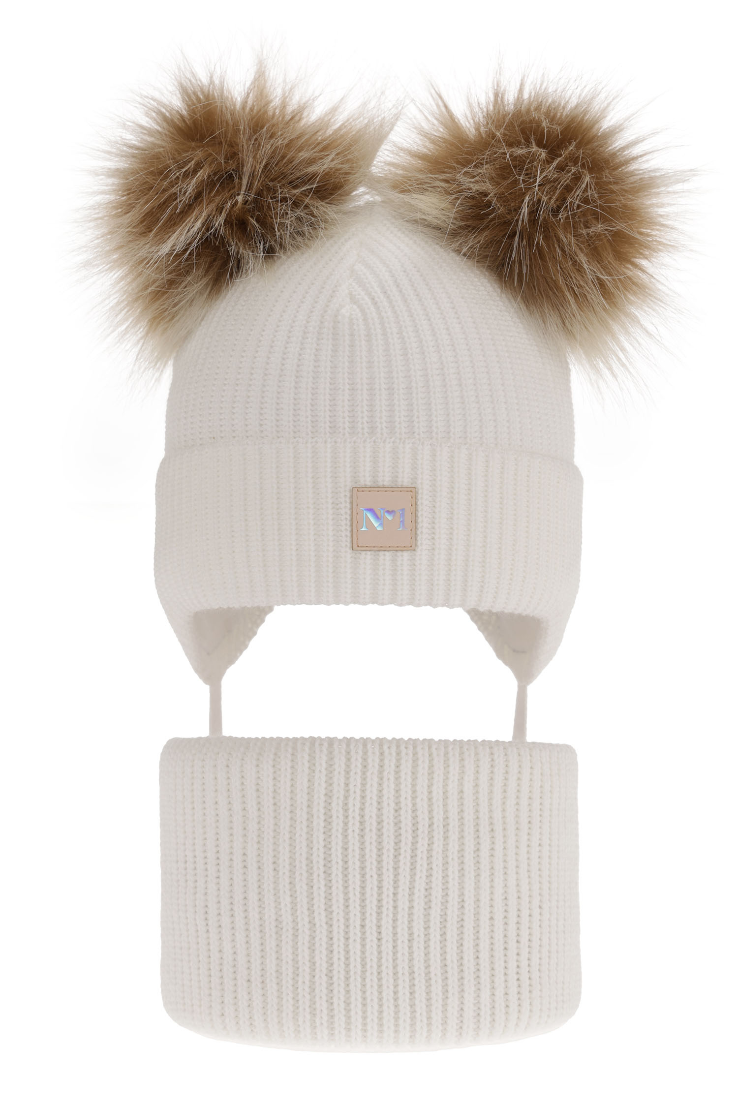 Czapka i komin dla dziewczynki zimowy komplet, biały, z dwoma pomponami, wiązany Kiara