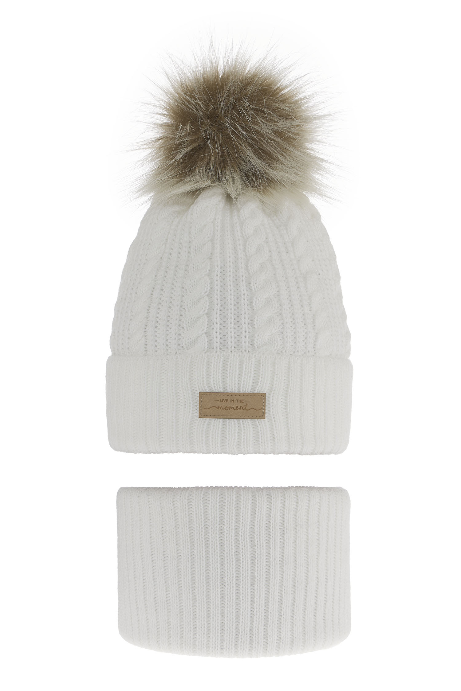 Czapka i komin dla dziewczynki zimowy komplet, biały, z pomponem Alika