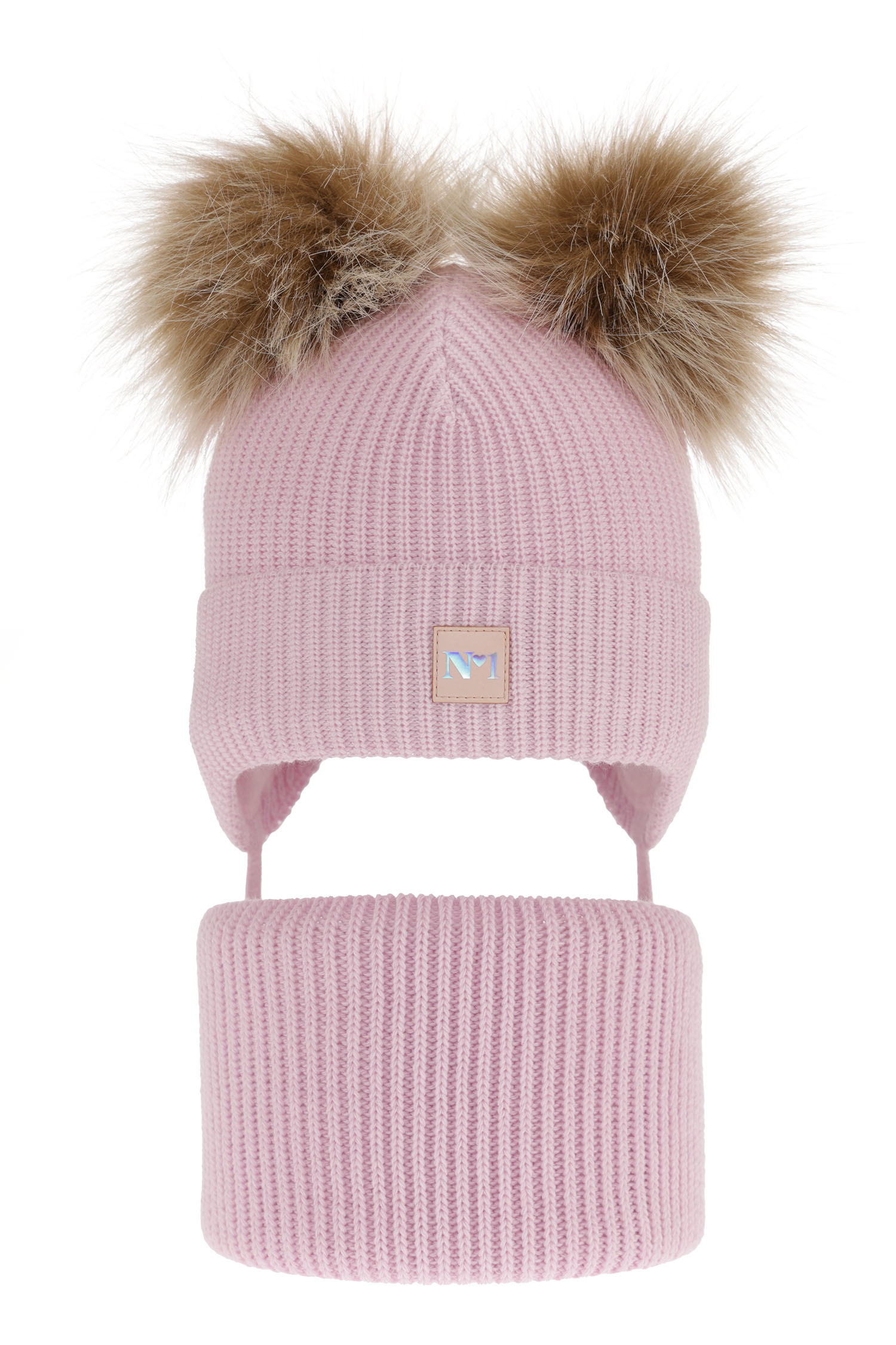 Czapka i komin dla dziewczynki zimowy komplet, liliowy, z dwoma pomponami, wiązany Kiara