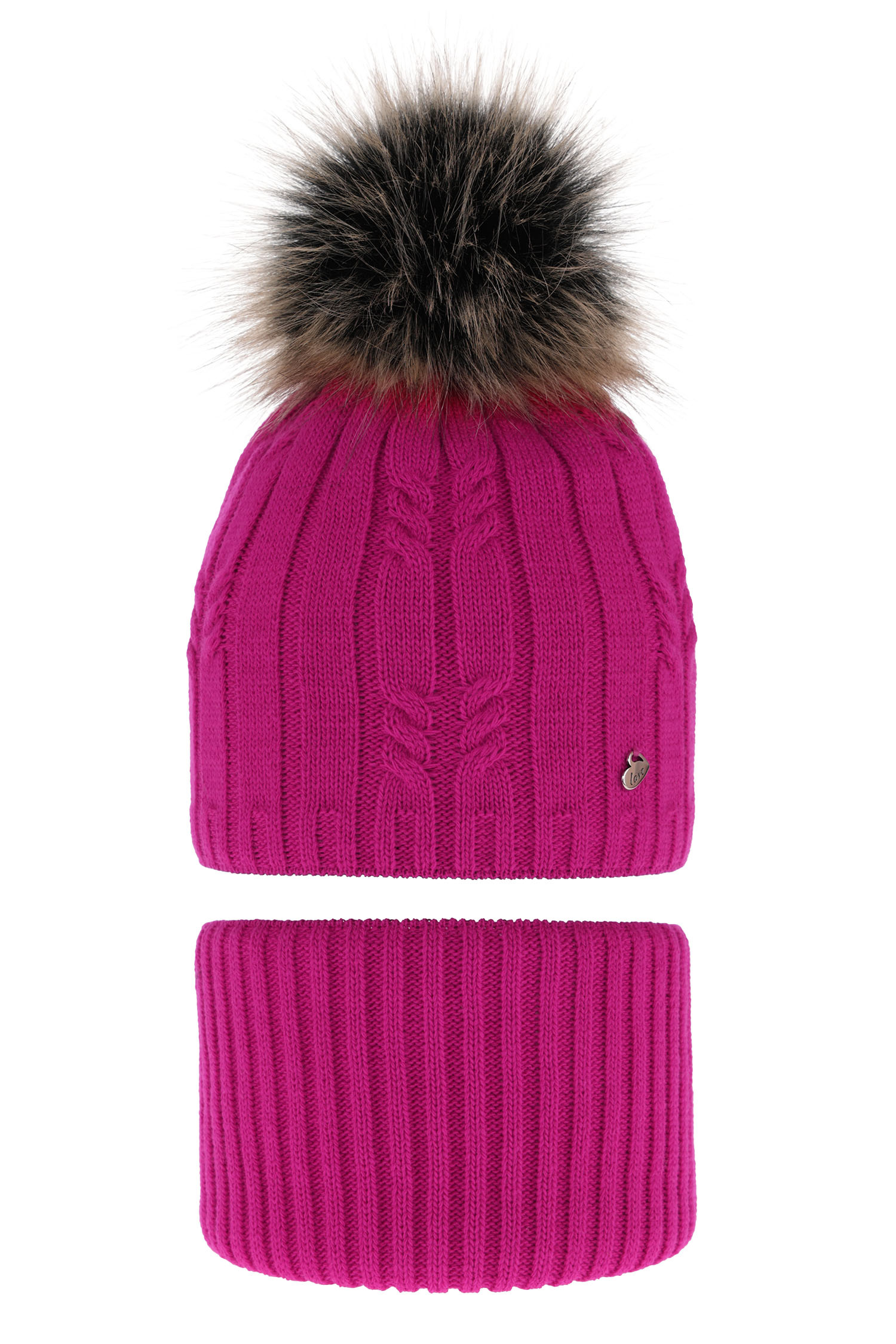Czapka i komin dla dziewczynki zimowy komplet, różowy, z pomponem Amaltea