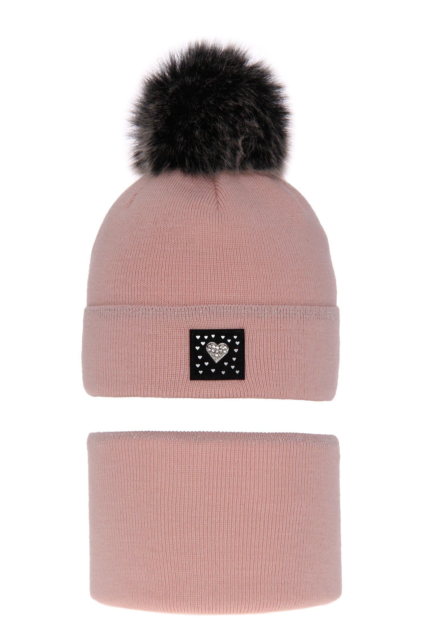 Czapka i komin dla dziewczynki zimowy komplet, różowy, z pomponem Sendi
