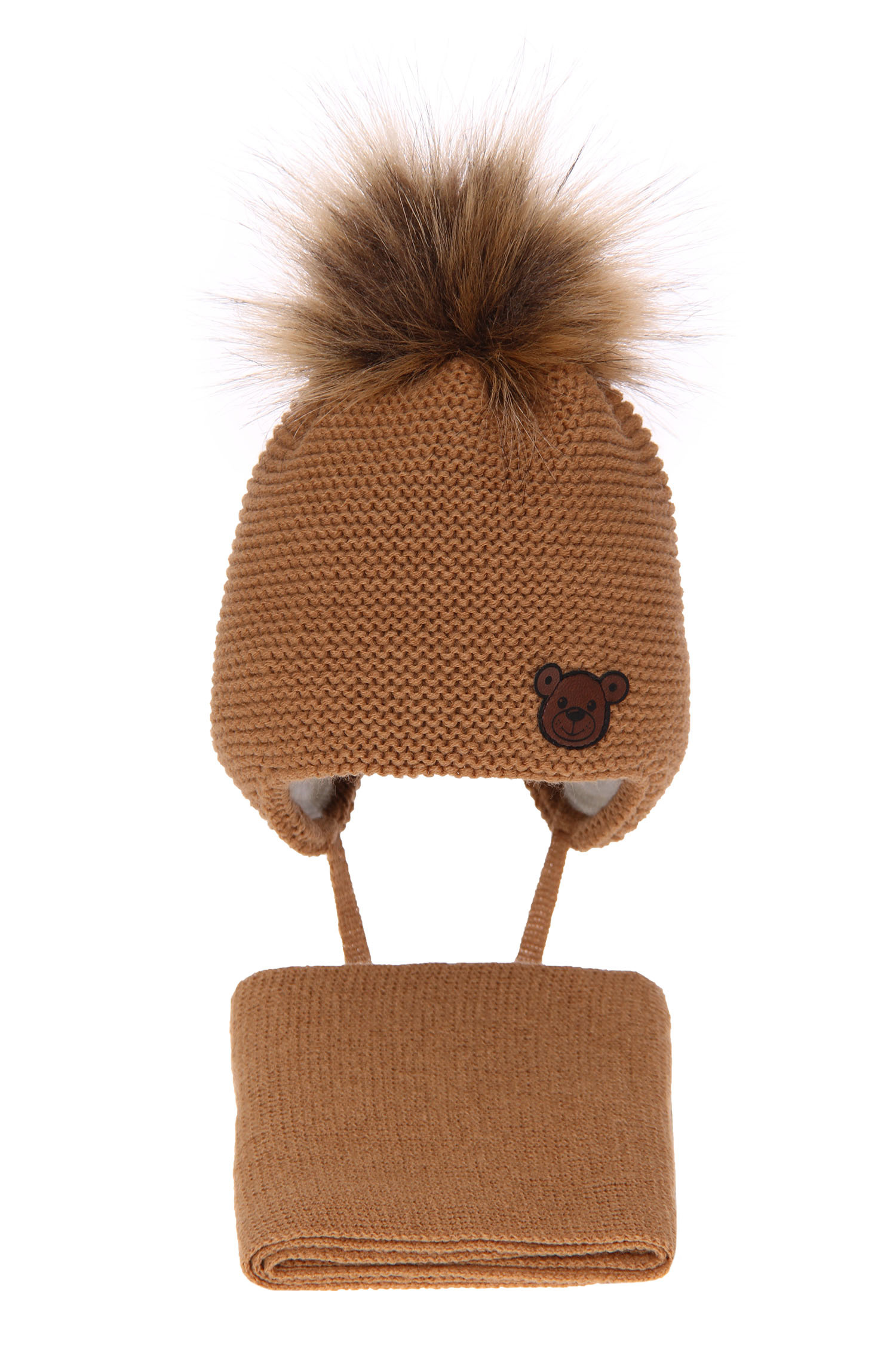 Czapka i szalik dla chłopca zimowy komplet, camelowy, z pomponem, wiązany Banksi