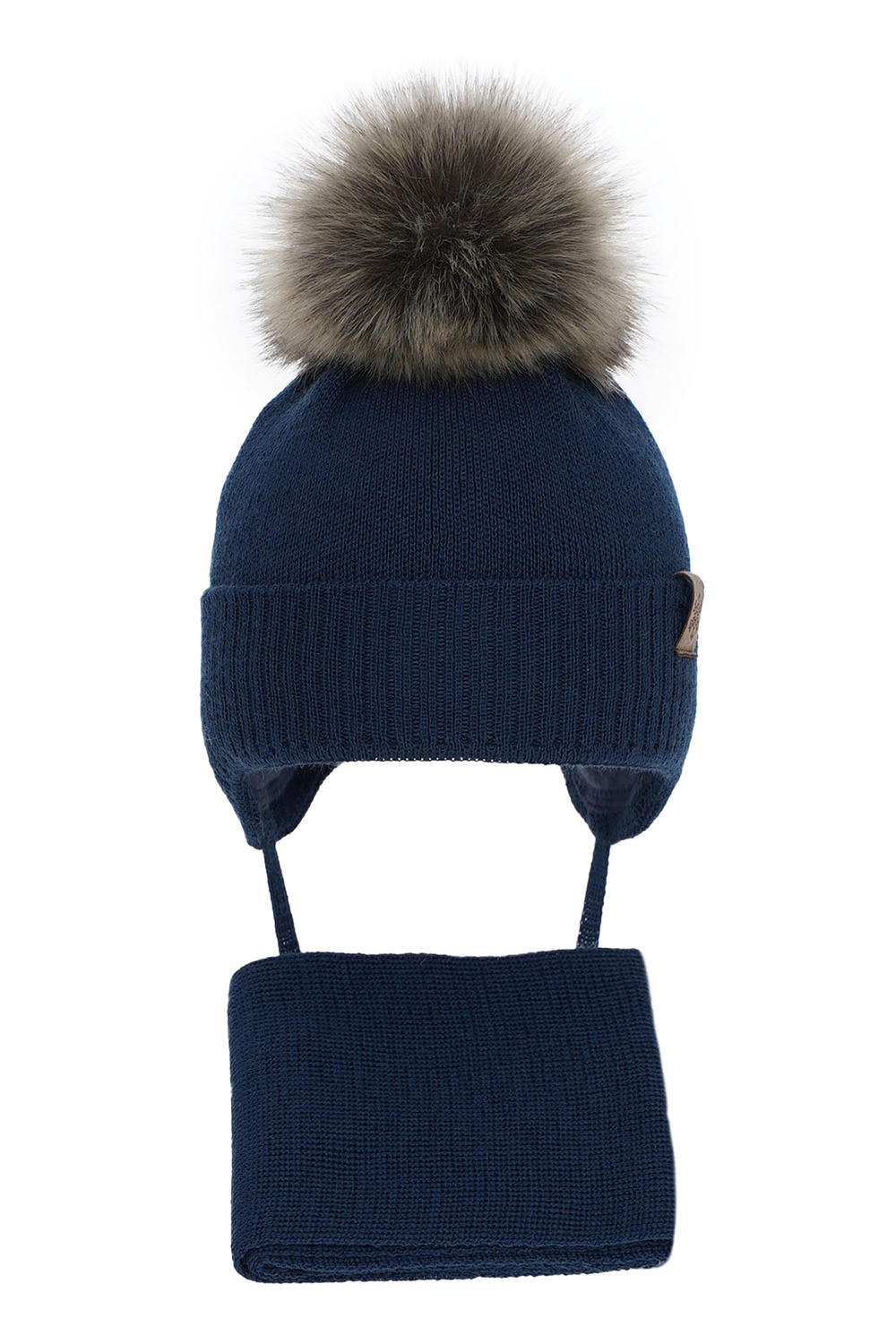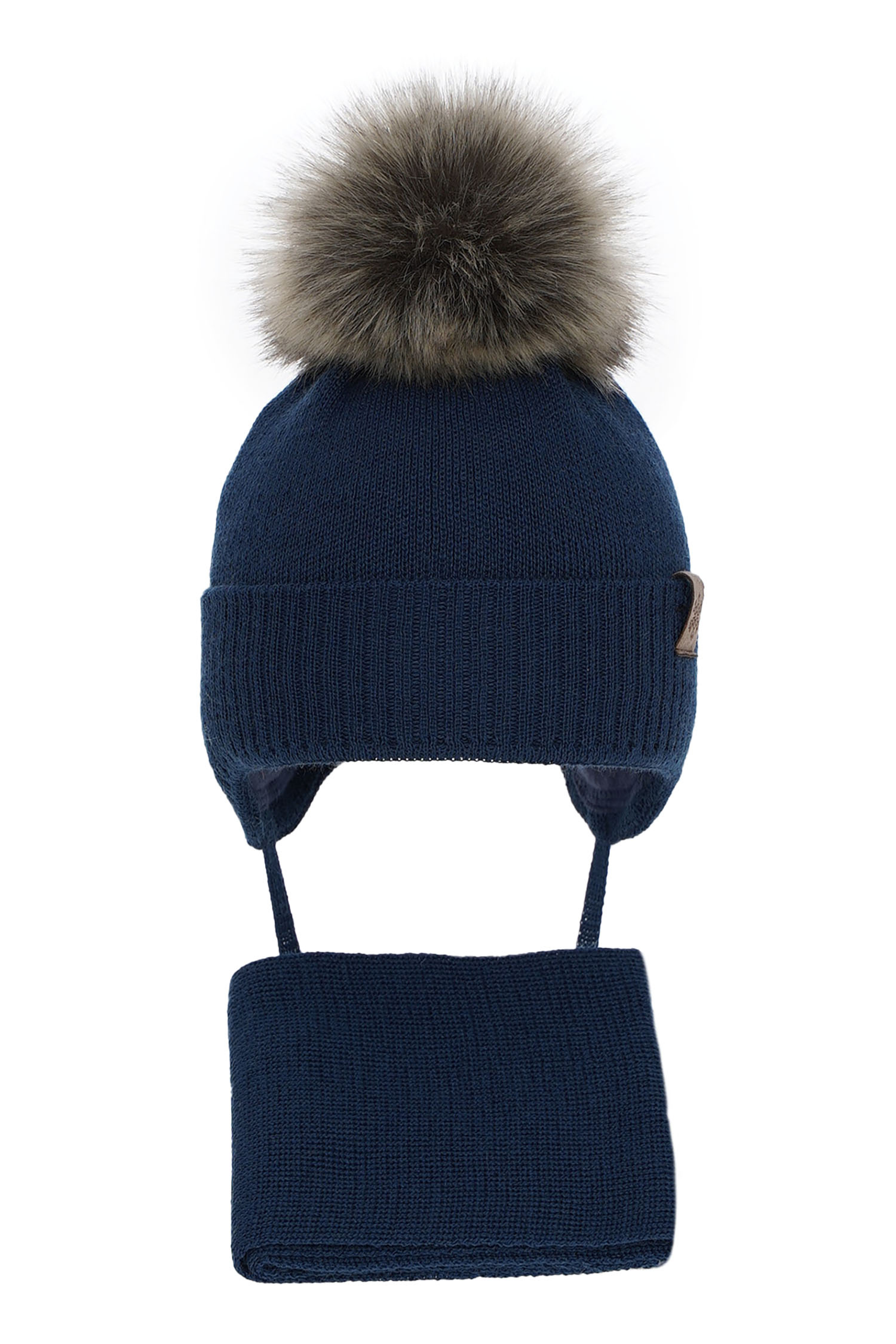 Czapka i szalik dla chłopca zimowy komplet, granatowy, z pomponem, z wełną merino, wiązany Rafael