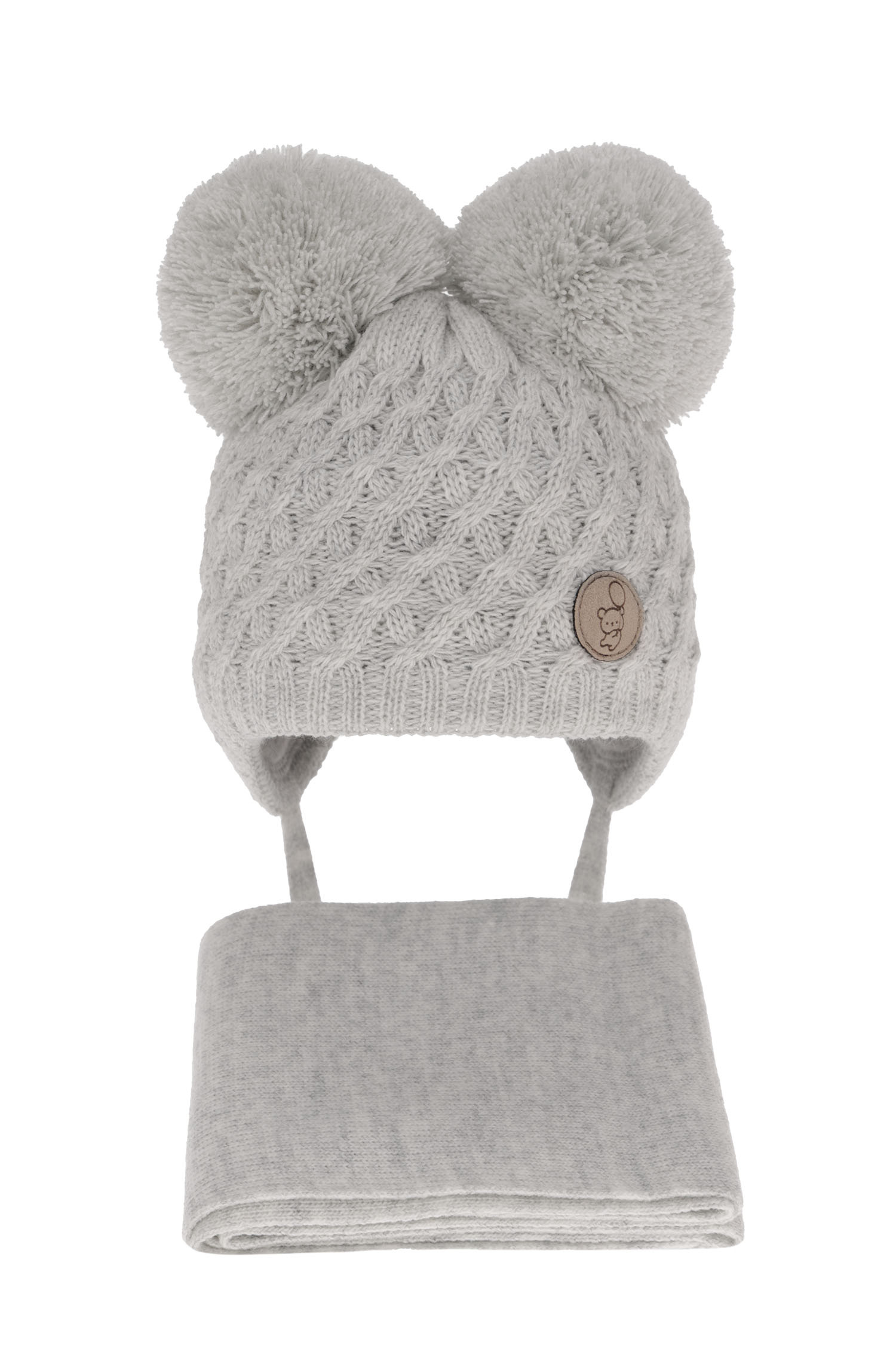 Czapka i szalik dla chłopca zimowy komplet, jasnoszary, wiązany, z dwoma pomponami Alonso