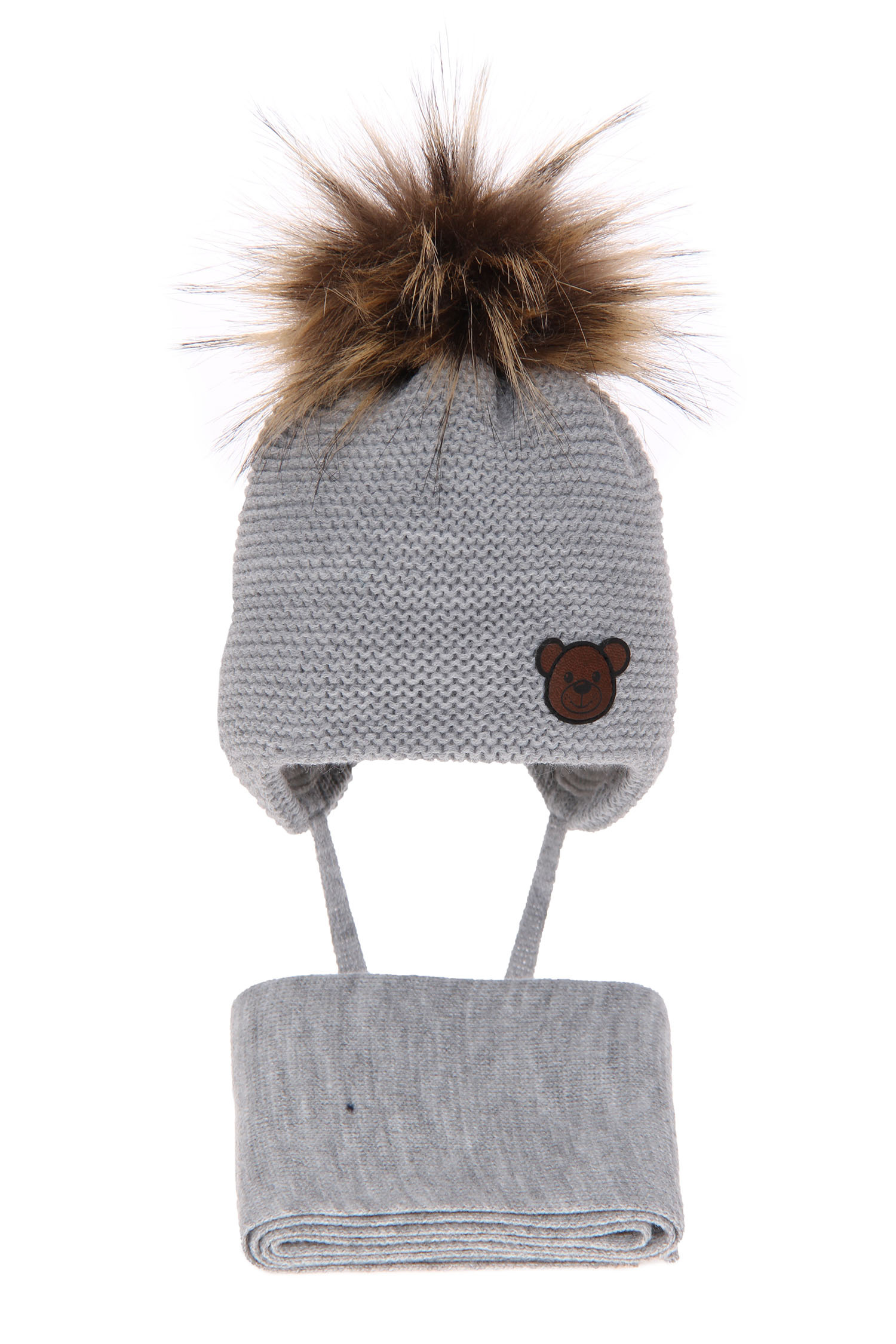 Czapka i szalik dla chłopca zimowy komplet, jasnoszary, z pomponem, wiązany Banksi