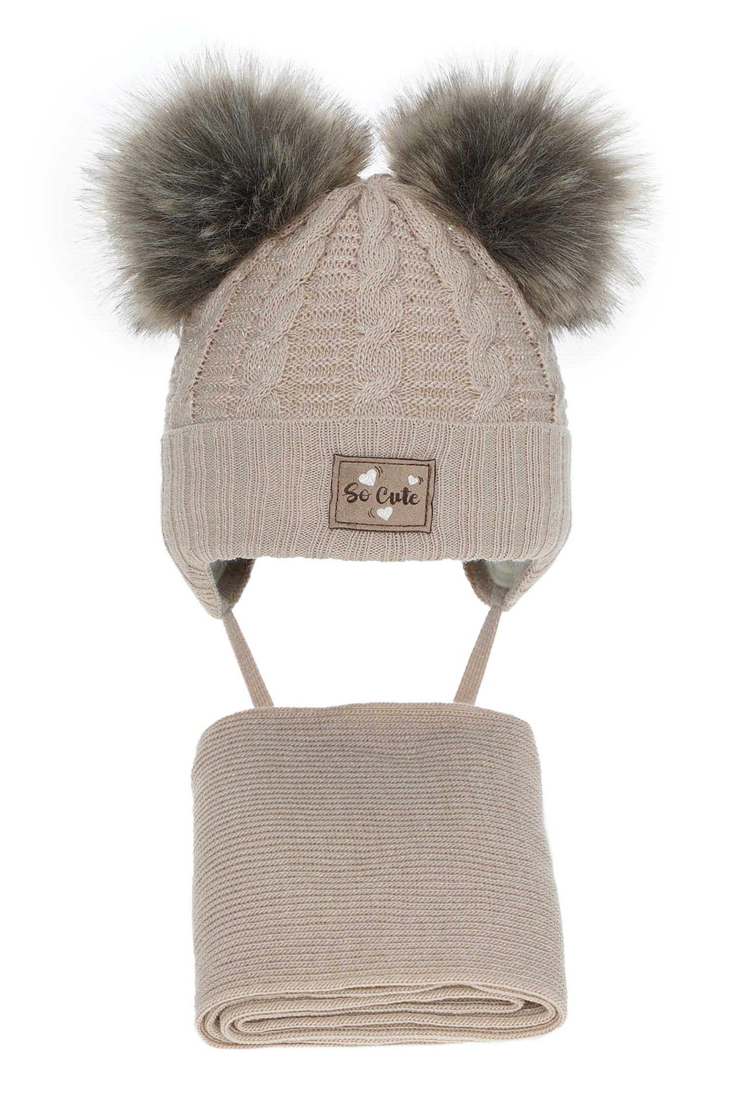 Opinie o Czapka i szalik dla dziewczynki zimowy komplet, beżowy, z błyszczącą nitką, z dwoma pomponami, wiązany Klarita