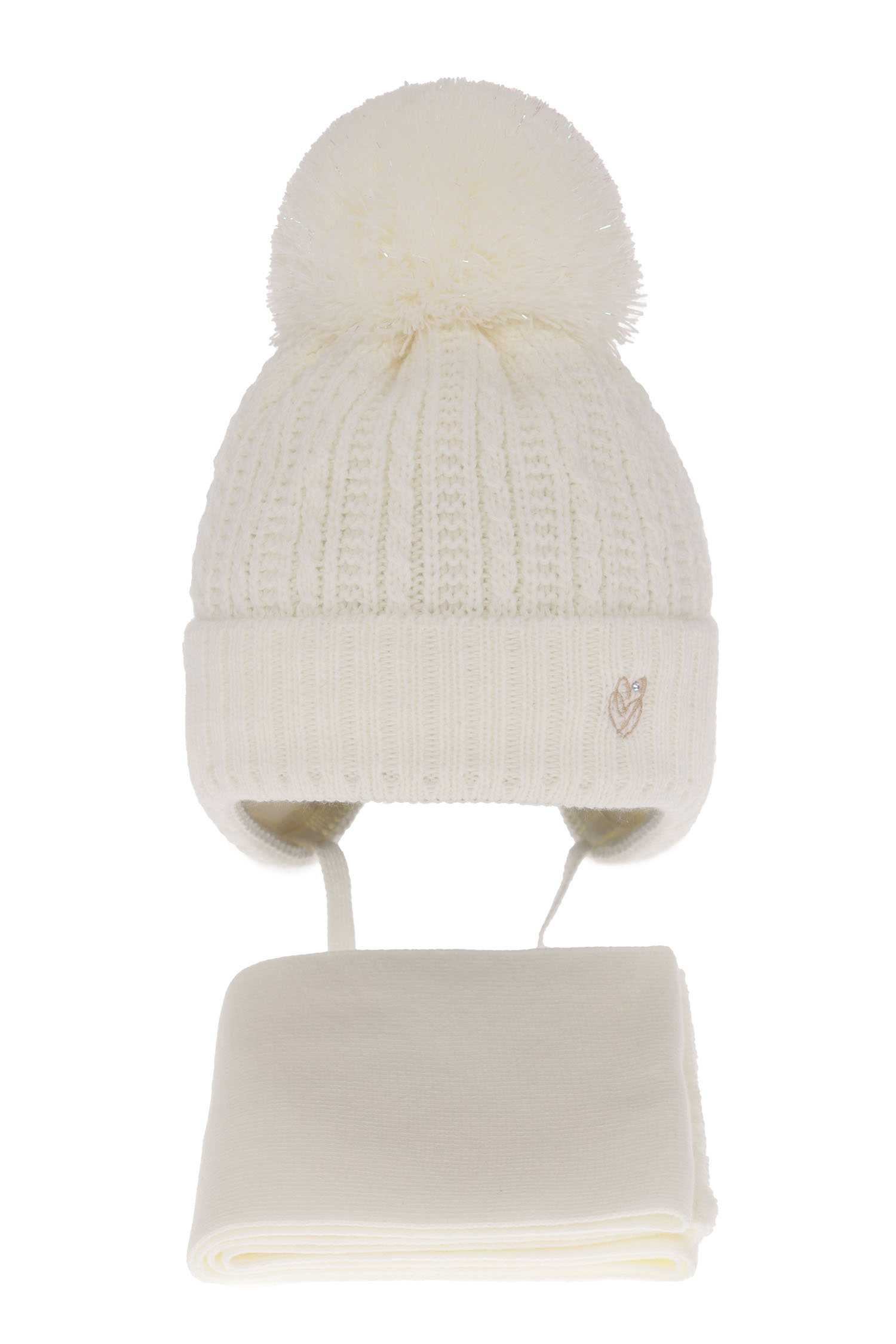 Czapka i szalik dla dziewczynki zimowy komplet, kremowy, wiązany, z pomponem Marisa