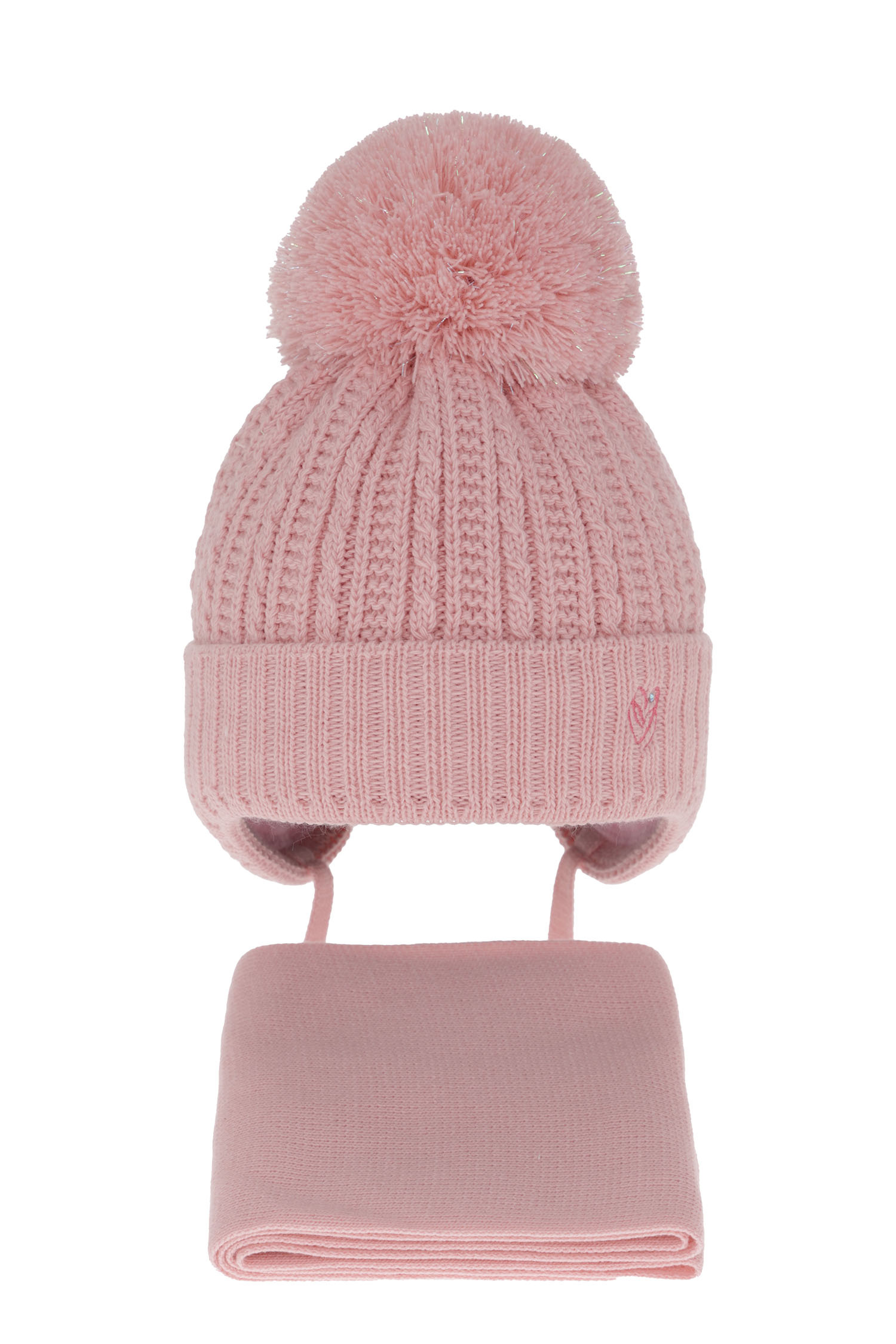 Czapka i szalik dla dziewczynki zimowy komplet, różowy, z pomponem, wiązana Marisa