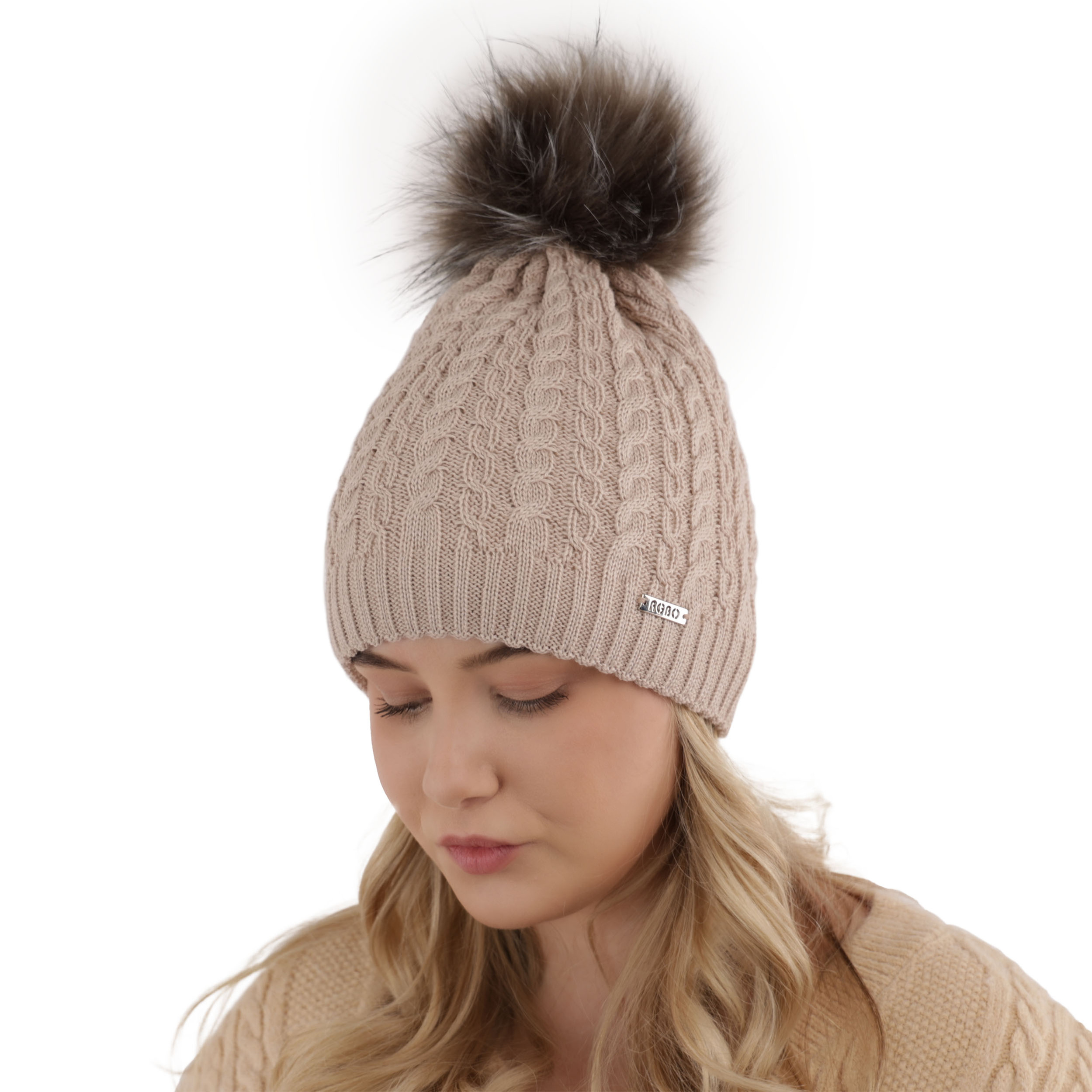 Czapka zimowa Satina wyróżnia się pięknym, warkoczowym splotem, który nadaje jej unikatowego charakteru. Elegancki wzór w połączeniu z luksusowym pomponem z ekofutra tworzy wyjątkową kompozycję, która przyciąga spojrzenia i podkreśla indywidualny styl. Dyskretna, metalowa naszywka z logo stanowi subtelny akcent, świadczący o jakości wykonania.